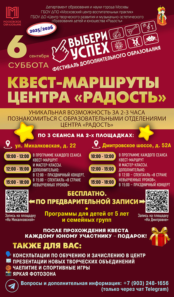 В Центре «Радость» 6 сентября ждут гостей как на основной образовательной площадке по адресу Михалковская ул., д. 22, так и на площадке «На Дмитровке» (Дмитровское шоссе, д. 52А).
