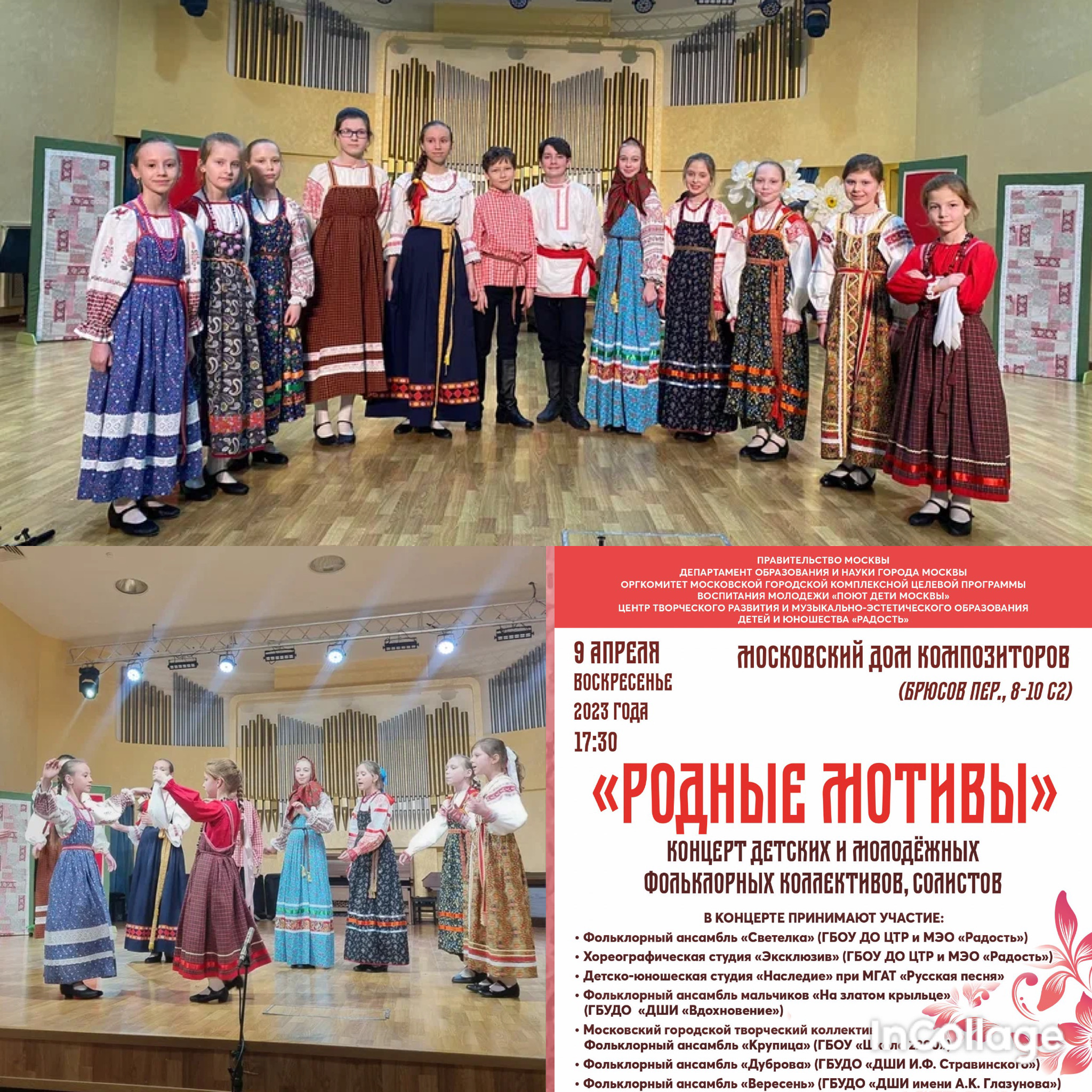 В рамках Московской городской целевой комплексной программы воспитания молодежи «Поют дети Москвы», приняли участие в концерте детских и молодежных фольклорных коллективов, солистов «Родные мотивы». Хочу сказать слова благодарности «Центру творческого развития и музыкально-эстетического образования детей и юношества "Радость" за достойные концертные площадки , прекрасную организацию и возможность участия в таких замечательных концертах. Искренне благодарю всех преподавателей причастных к этому мероприятию! Отдельная благодарность Карасевой Олесе Анатольевне! Преподаватель отделения «Музыкальный фольклор» ГБУДО г. Москвы «ДМШ им. А. К. Глазунова», руководитель ансамбля «Вересень» Самойлова Юлия Александровна.